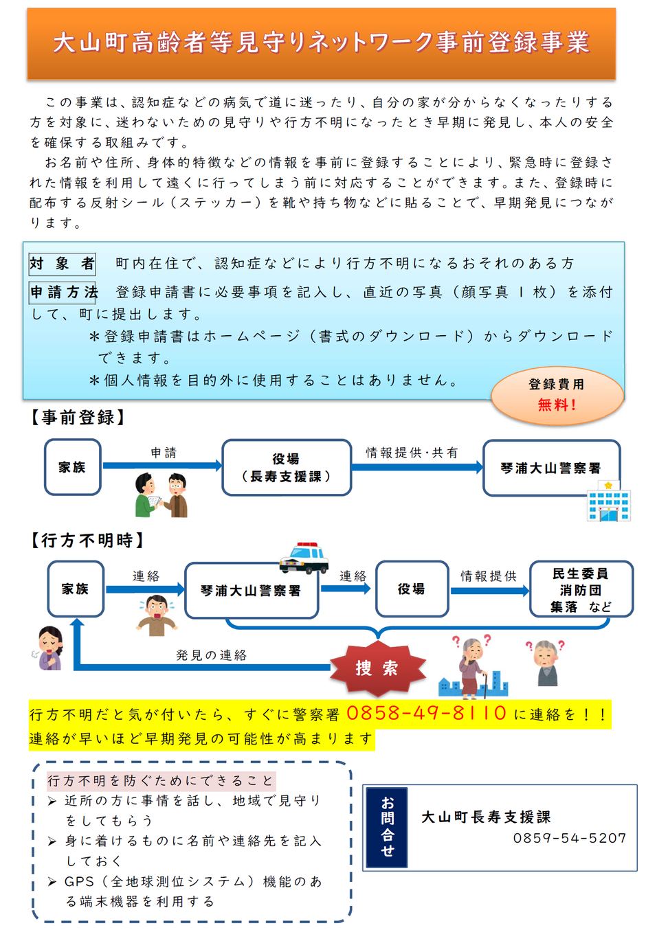 見守りネットワークに登録された方は、大山 町認知症個人賠償責任保険をご利用いただける場合があります。詳しくは長寿支援課までお問い合わせください。