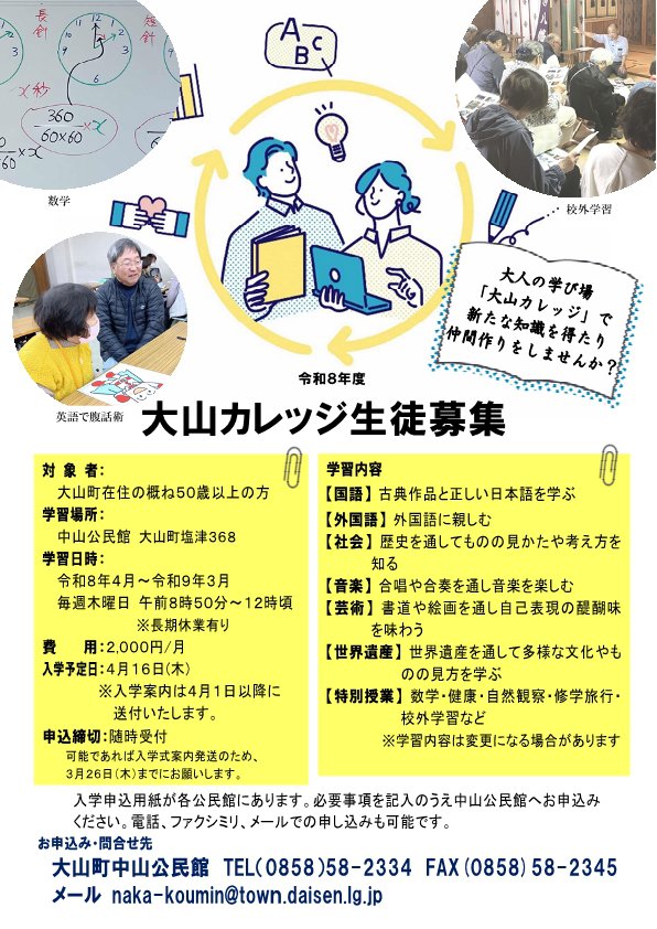 ​​​大人の学びの場「大山カレッジ」で新たな知識を得たり、仲間作りをしませんか?