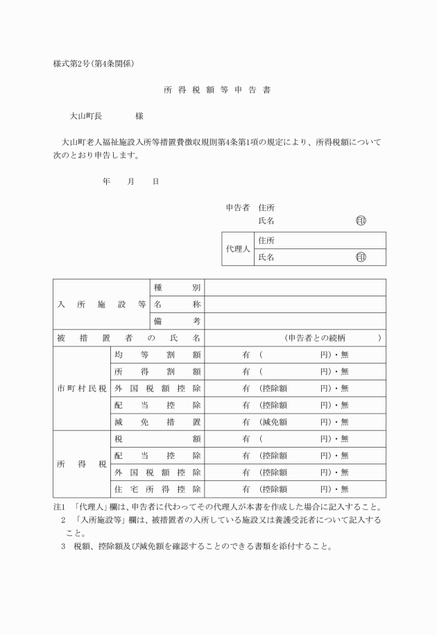 第4条 被措置者及び主たる扶養義務者は、施設入所等の措置が開始されたときは、その開始後速やかに、当該老人福祉施設入所の措置がその翌年度以降も引き続き行われるときは、その行われる間、次に掲げる書類等を期限までに町長に申告しなければならない。
